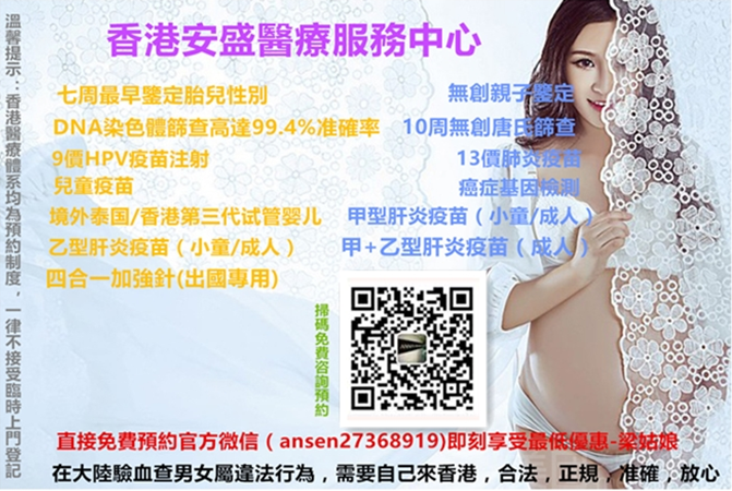 若刪或者打不開請點(diǎn)快照*香港安盛醫(yī)療中心24小時免費(fèi)咨詢,熱線: 00852-27368366 直接預(yù)約官方微信(ansen27368919)即刻享受最低優(yōu)惠-梁姑娘-*香港化驗所做DNA鑒定胎兒性別, 安全-快速-準(zhǔn)確-無創(chuàng), 1-2天可出鑒定結(jié)果,詳細(xì)流程,歡迎來電咨詢預(yù)約! 其它項目:(香港無創(chuàng)親子鑒定、10周無創(chuàng)唐氏篩查、13價肺炎疫苗注射、兒童疫苗注射、9價HPV疫苗注射、試管嬰兒、癌癥基因檢測…),(在大陸驗血查男女屬違法行為,需要自己來香港,合法,正規(guī),準(zhǔn)確,放心)。
