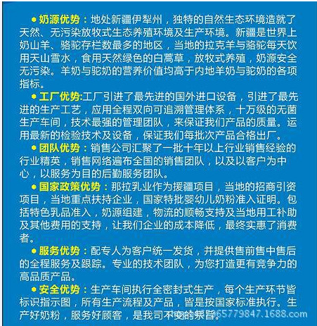 做駱駝奶粉為什么選擇那拉乳業(yè)? 1、奶源地工廠,駱駝奶源豐富; 2、全新自動(dòng)化生產(chǎn)設(shè)備,品質(zhì)保證; 3、奶粉生產(chǎn)中先進(jìn)干濕法生產(chǎn)工藝,用嬰幼兒的生產(chǎn)標(biāo)準(zhǔn)嚴(yán)控產(chǎn)品; 4、擁有國(guó)家許可的特色乳品(駱駝奶)生產(chǎn)許可證; 5、位于那拉提核心景區(qū)旁,周邊旅游配套資源豐富;